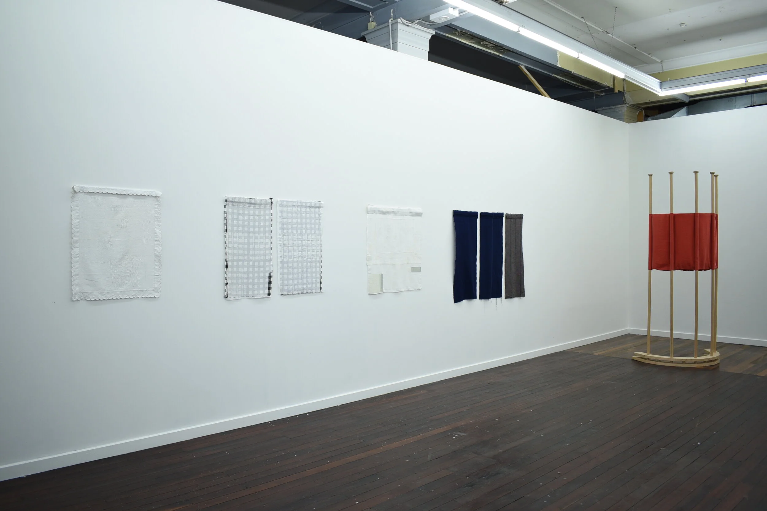 Also working with found, humble, and familiar household items such as tablecloths, blankets and cloth napkins is Deborah Prior and Kay Lawrence. Both artists have gone through a process of mending simple fabrics. Their bodies of works are like sewn up skins that are beginning to heal. Lawrence’s six textiles were made between 2012 and 2016 from found and hand-me-down odds and ends that the artist collected from around the world. Lawrence explained, “handwoven cloth from India and indigo dyed cloth, Japanese Kimono fragments.” She has repaired them all slowly and carefully with running stitch “the simplest of stitches”. Prior has collected all the pieces of a pair of blankets that have been used in various projects and even been scrap material “used to plug holes!” This exhibition has been her motivation to find all the repurposed sections of blanket and slowly and painstakingly put the blankets back together so that (maybe) they can be whole again. But as the artist confessed: “no time or pain or effort can repair things exactly as they were.”