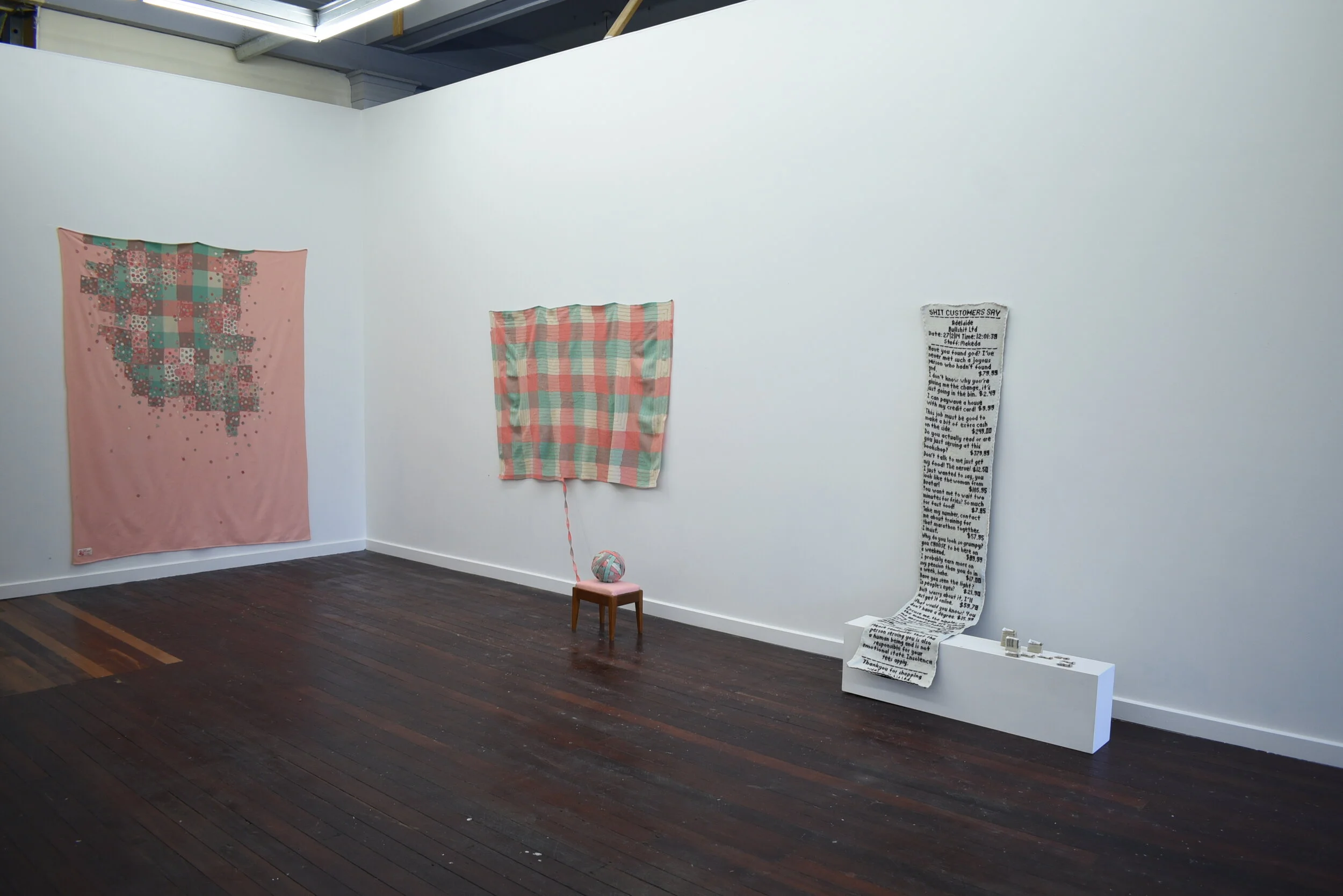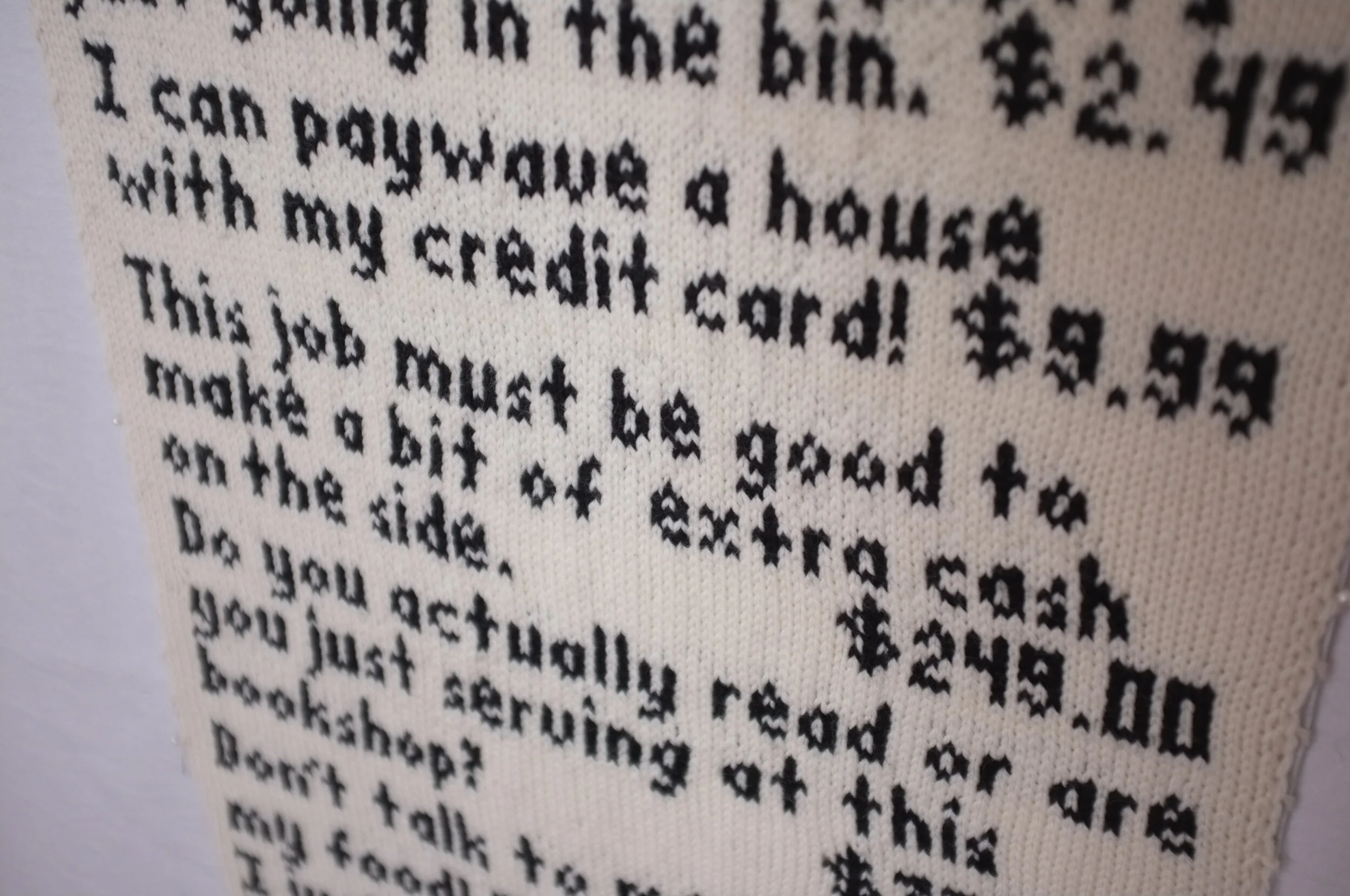Makeda Duong also makes art that directly references her lived experiences and her identity as a Vietnamese Australian woman. Her work explores experiences of inequality and absurdity while working in customer service roles. She knits real quotes from real customers, highlighting class division and the superiority experienced in a world where the customer is always right. When talking about the Shit Customers Say series the artist said, “I don’t want it to be negative necessarily, I want it to be quite funny.” Through humour she draws the audience member in and takes them on a journey, a day in the life of a customer service worker.