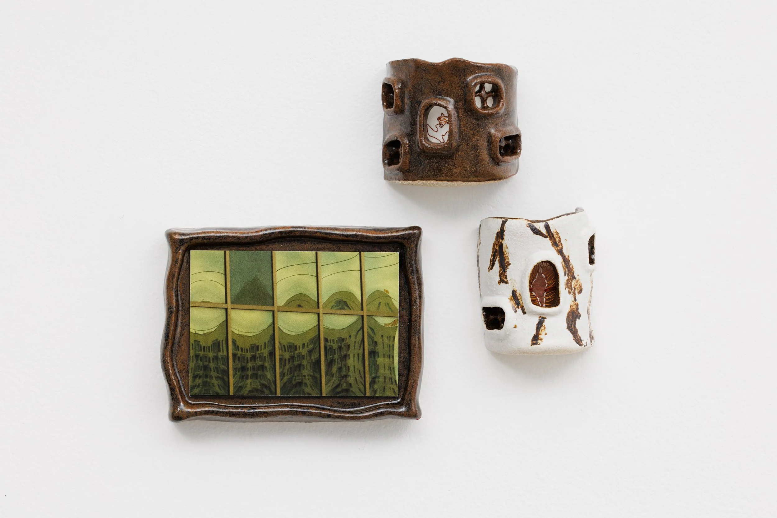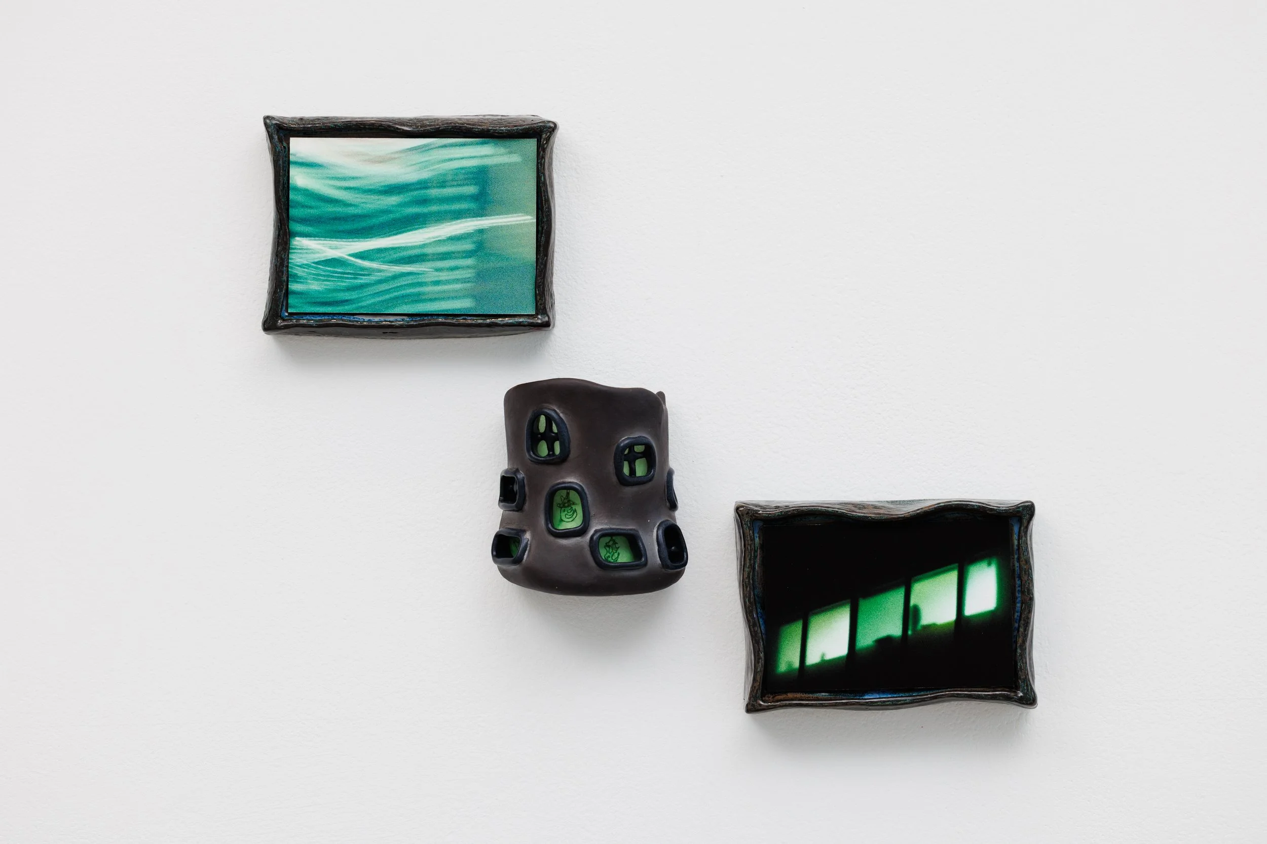 In their photographs of the glass panes of city windows, the artist captures a sense of gazing at windows, as though trying to discern the lives lived behind their opaque surfaces. On the edge of figuration and abstraction, these works contain an eerie, lurid distortion that is further emphasised by being encased in hand-built ceramic frames.