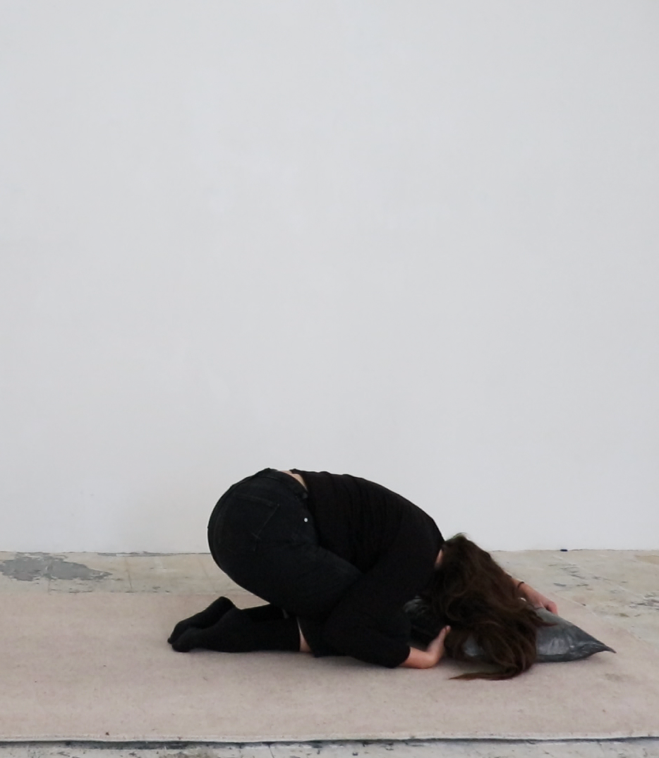 This exhibition comprises: a hollow lead pillow placed on a carpeted area of the floor, the soft metal pressed to capture the design, texture and shape of an actual pillow – welded at the seams, it is stuffed with down, tiny gaps allowing the occasional egress of feathers; a light switch cast in lead and mounted on the wall; an actual light, its bulb hanging low over the pillow; small shelves and boxes made from lead plates; upon and within these rest substances, including soil, feathers, and a hairball (crafted from the artist’s own hair); two framed prints, these made by pressing the artist’s parents’ pillows with paper, so it has embossed into it the folds of the fabric, and has absorbed the parents’ night-time bodily effusions, sweat, oils and saliva; and a video monitor showing a performance in which Stone kneels, presses their head to the lead pillow, hair cascading over it, and slowly and laboriously pushes it across the carpet.